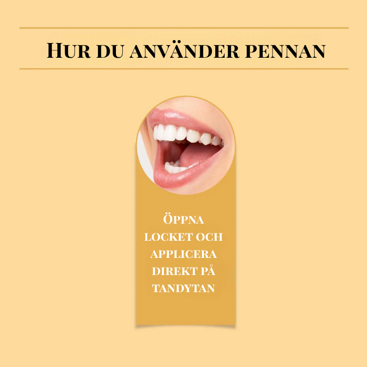 Svar 1: Användningen är enkel! Börja med att borsta och tandtråda tänderna, torka dem sedan med en vävnad. Vrid botten av pennan medsols för att aktivera gelen och applicera ett tunt lager på varje tand med borsten. Undvik att få gelen på tandköttet. Låt tänderna vara ostörda i 30 minuter efter applicering för bästa resultat.